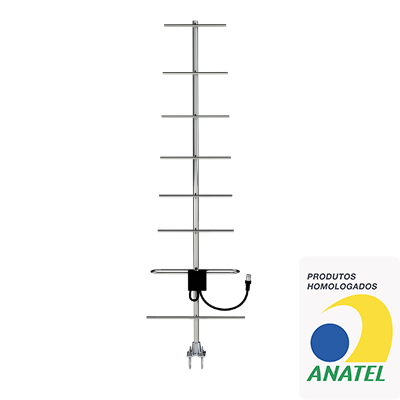 Antena direcional de alto ganho do tipo YAGI, fabricada em liga especial de alumínio, com excelente resistência mecânica e alta condutibilidade elétrica.